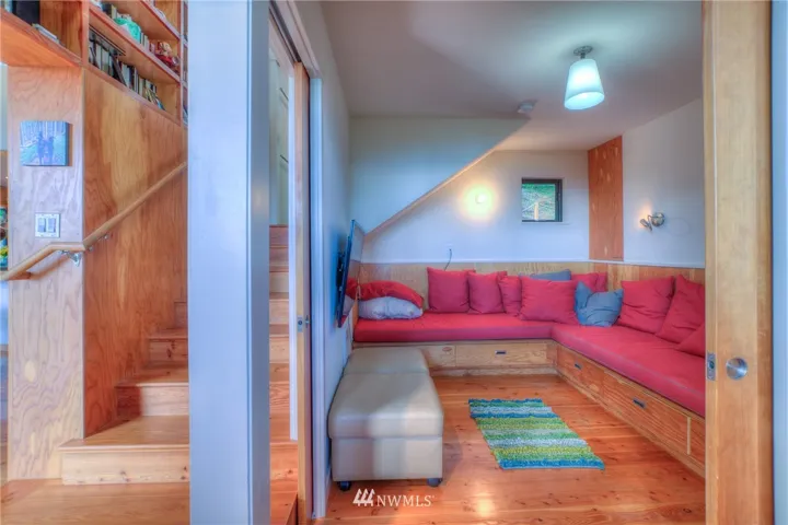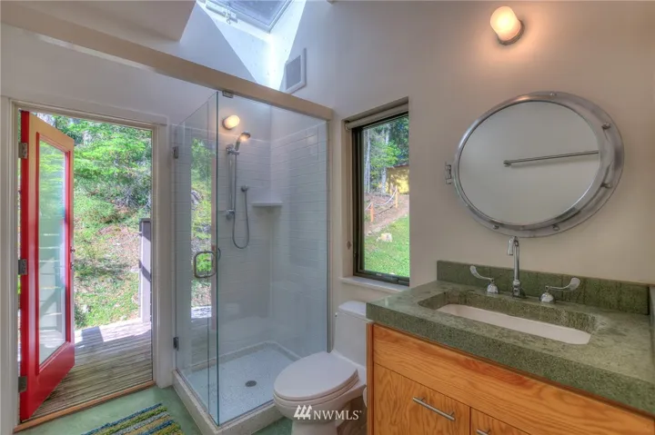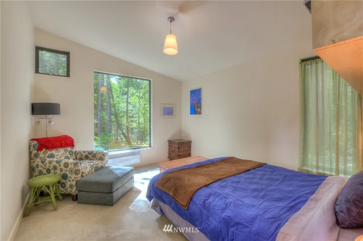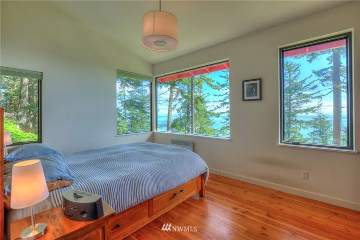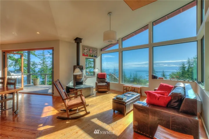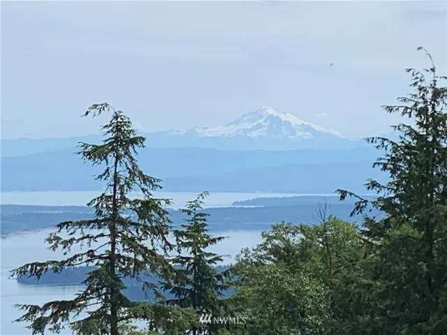 Atop a peak on Buck Mt, this contemporary & private 2 bed home plus studio/bedroom/bath on 9+ acres enjoys entrancing vistas northeast over Lummi to the Cascades, including Mt Baker. Utilitarian style yet sophisticated w/ built-ins, concrete & plywood in a comfortable & compact interior. Main floor has open kitchen/island/dining, living area, master suite, convertible second bedroom/media room & 2nd floor office space. Living is extended outdoors with decks, shower + garden and Curmudgeon Cabin.