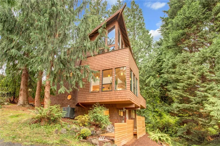 West Bellevue Serenity. Down a wooded road, your Pacific Northwest Contemporary sits nestled amongst mature woodland. 4-story, 3BD, 2.5BTH, with extensive vaulted ceilings and windows and maximum exposure to lush setting. Just minutes from downtown Bellevue with easy access to major freeways. Lot includes wired outbuilding for storage or studio, multiple decks, backyard bbq deck and carport. Always a peaceful end to the day coming home here. Thanks for looking.